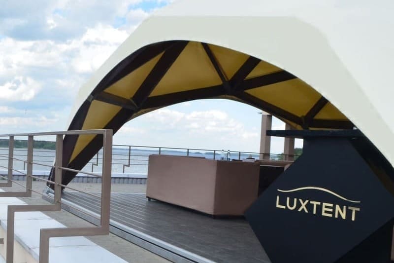 Современный деревянный шатер с тентовым покрытием станет отличным дополнением вашей летней террасы